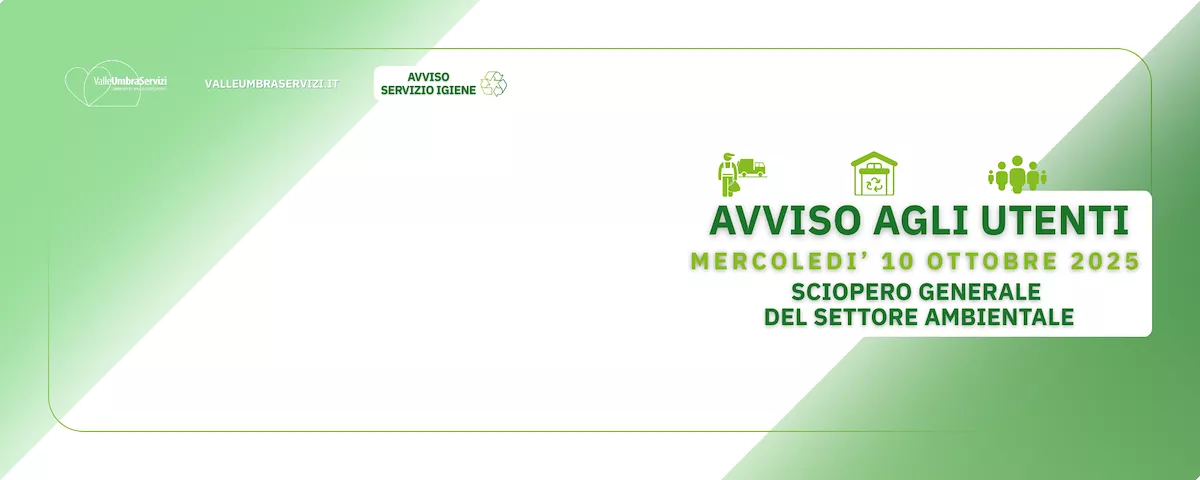 Valle Umbra Servizi S.p.A. informa che, a seguito della proclamazione di uno sciopero generale nazionale del settore ambientale da parte delle organizzazioni sindacali FP-CGIL, FIT-CISL, UILTrasporti e FIADEL, nella giornata di mercoledì 10 dicembre 2025, potrebbero verificarsi disservizi nella gestione dei servizi di igiene urbana, per l’intero arco della giornata lavorativa.