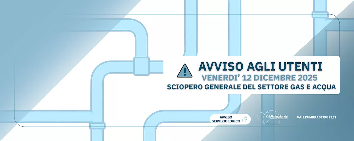 Valle Umbra Servizi S.p.A. informa che, a seguito della proclamazione di uno sciopero generale nazionale da parte della CGIL, nella giornata di venerdì 12 dicembre 2025, potrebbero verificarsi disservizi relativi alla gestione dei servizi gas e acqua, per l’intera giornata lavorativa.