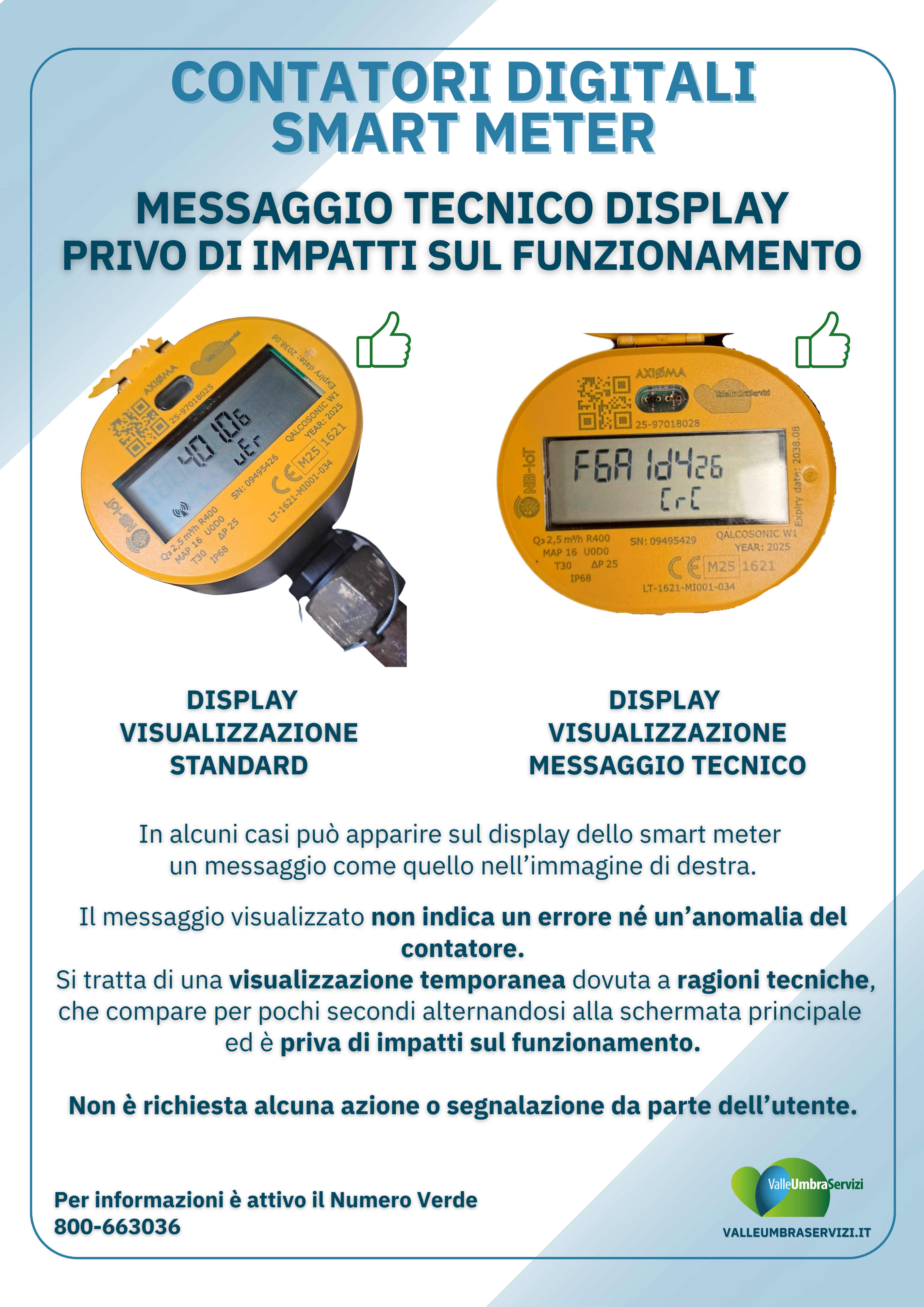Prima di rivolgersi a Valle Umbra Servizi, soprattutto nel caso di bollette con consumi molto più elevati del solito, è consigliabile effettuare una prima verifica in autonomia, chiudendo tutti i rubinetti e verificando se il numeratore del contatore gira. In questo caso il maggior consumo è imputabile alla rottura dell’impianto privato e non al cattivo funzionamento del contatore.