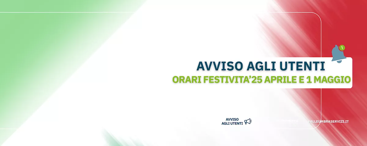 Valle Umbra Servizi informa i gentili utenti che, in occasione delle prossime festività, sabato 25 aprile e venerdì 1° maggio 2026 resteranno chiusi al pubblico: