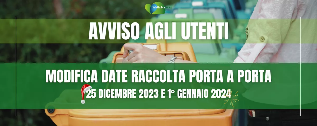 Valle Umbra Servizi S.p.A. informa gli Utenti che, il 25 dicembre 2023 ed il 1° gennaio 2024, la raccolta PaP seguirà le seguenti modifiche: