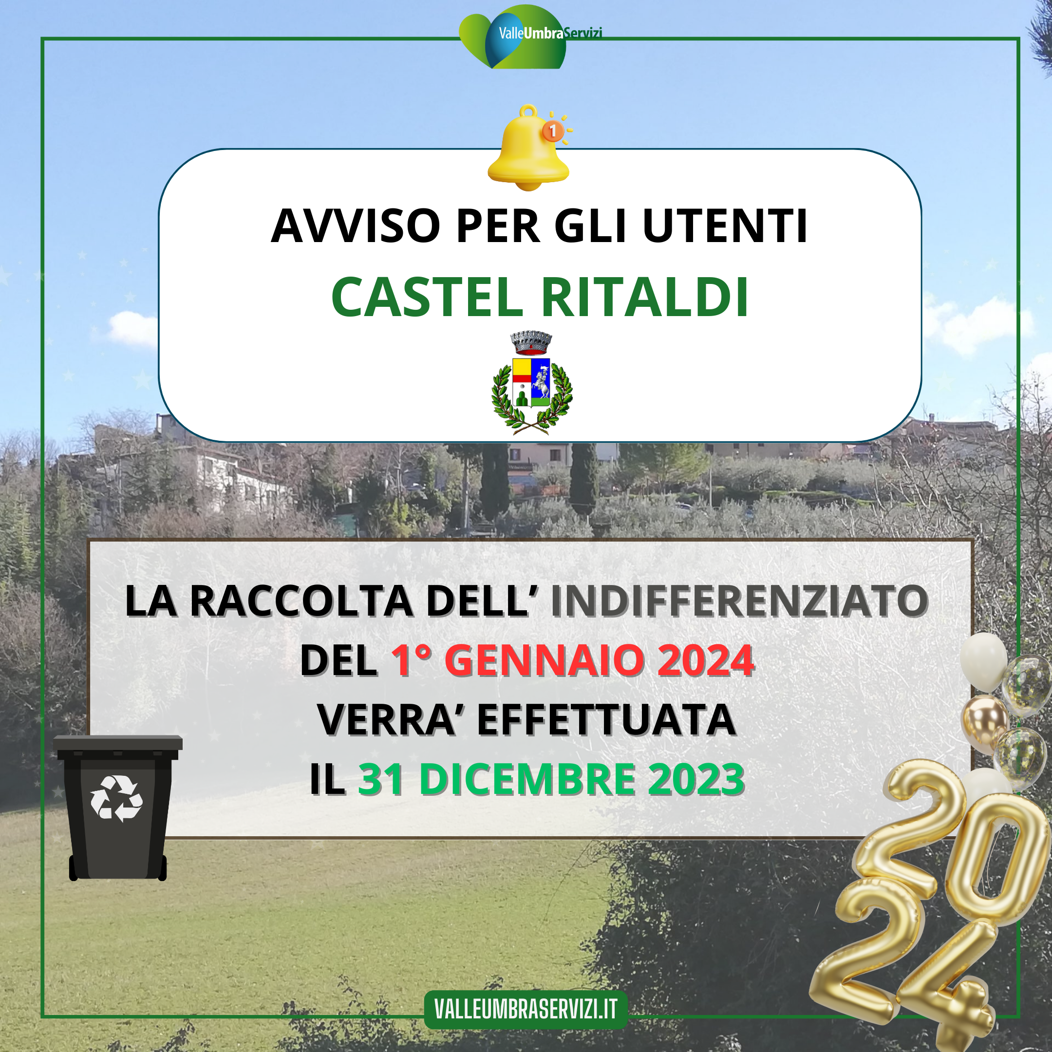 la raccolta dell'indifferenziato del 1° gennaio 2024 verrà effettuata il 31 dicembre 2023 |