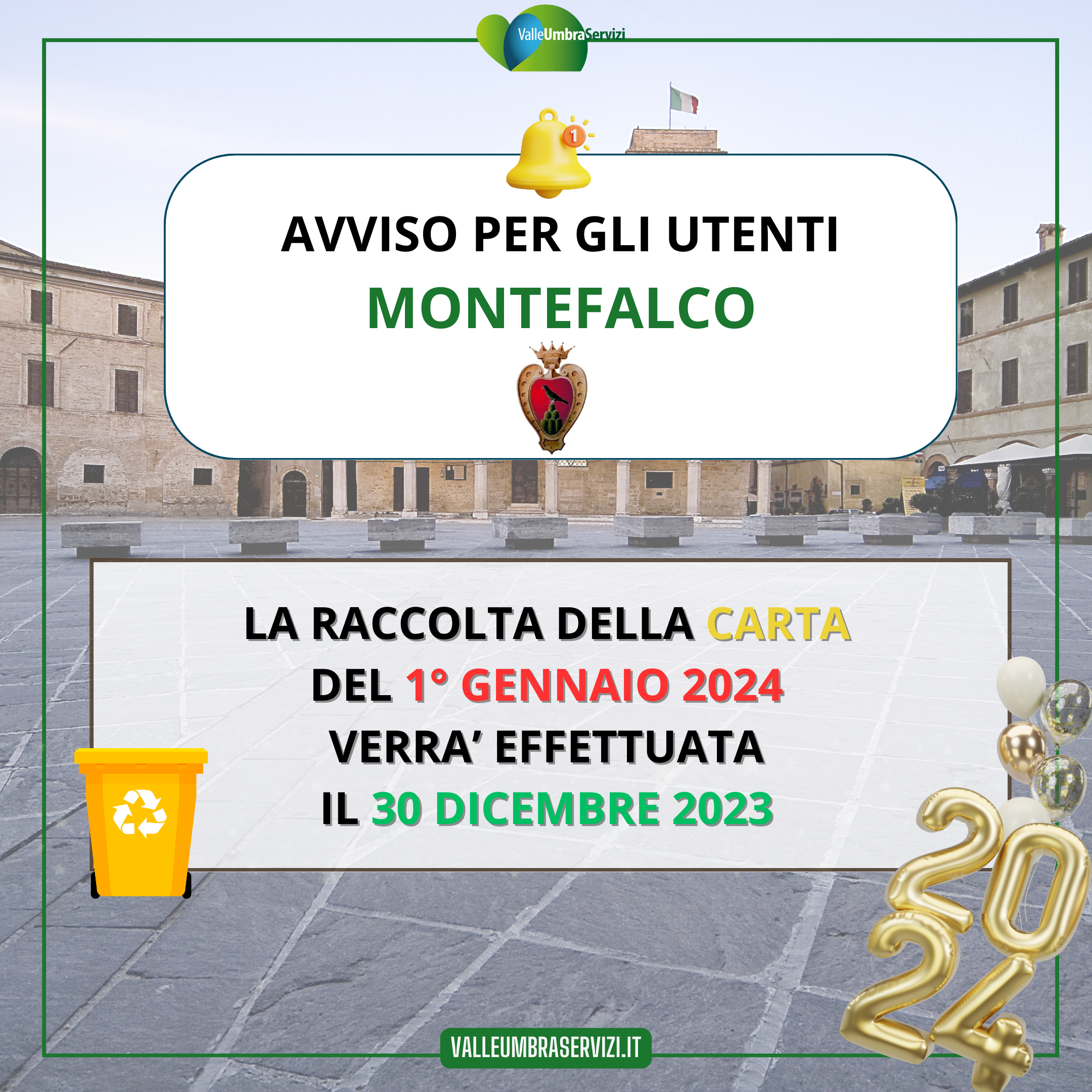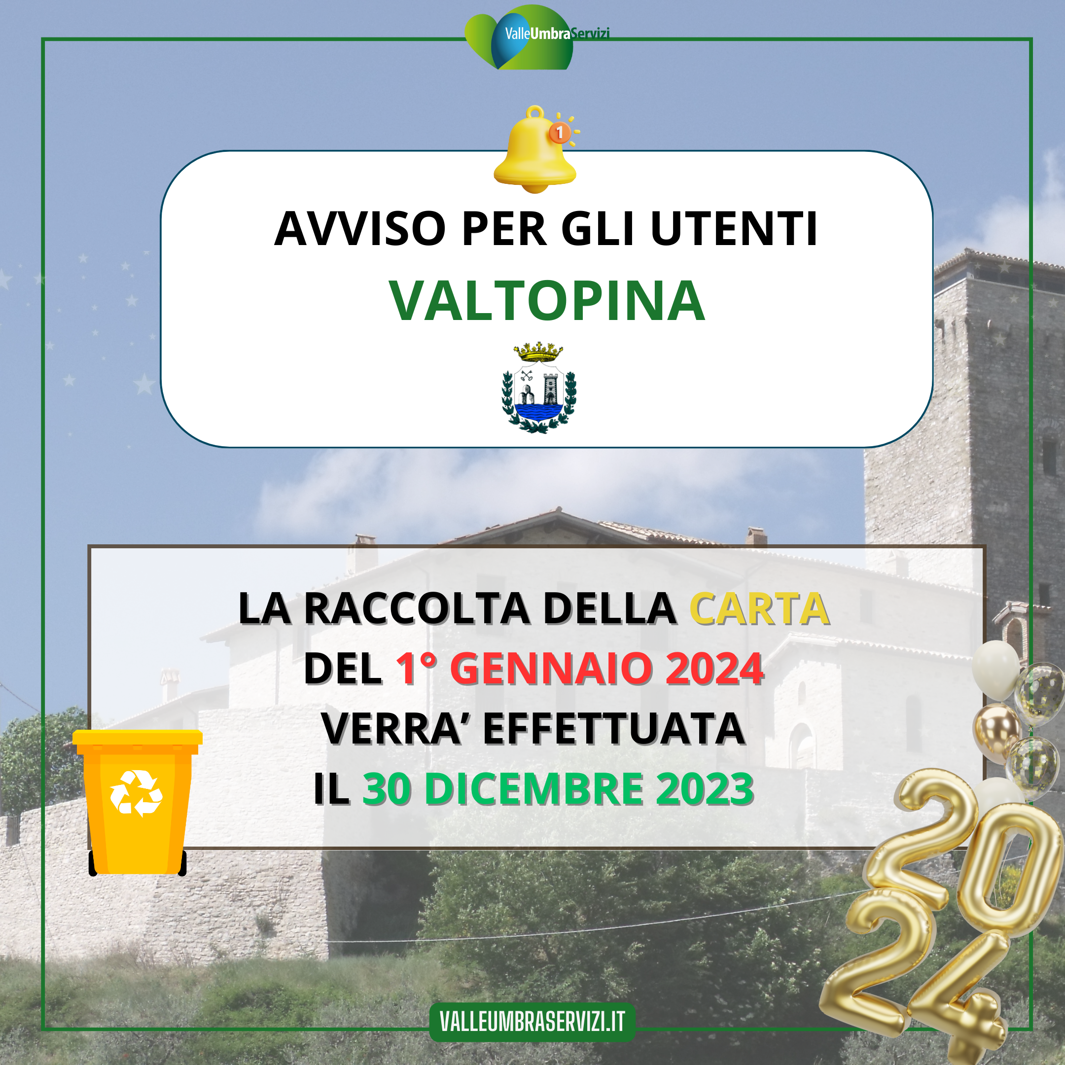 la raccolta della CARTA del 1° gennaio 2024 verrà effettuata il 30 dicembre 2023 |