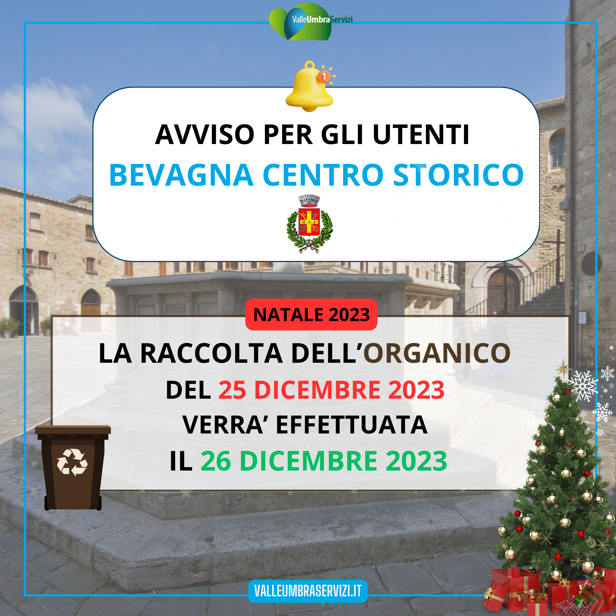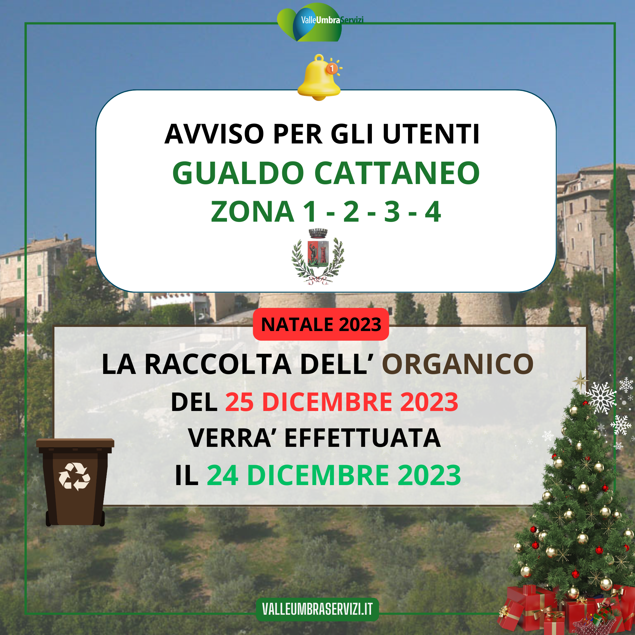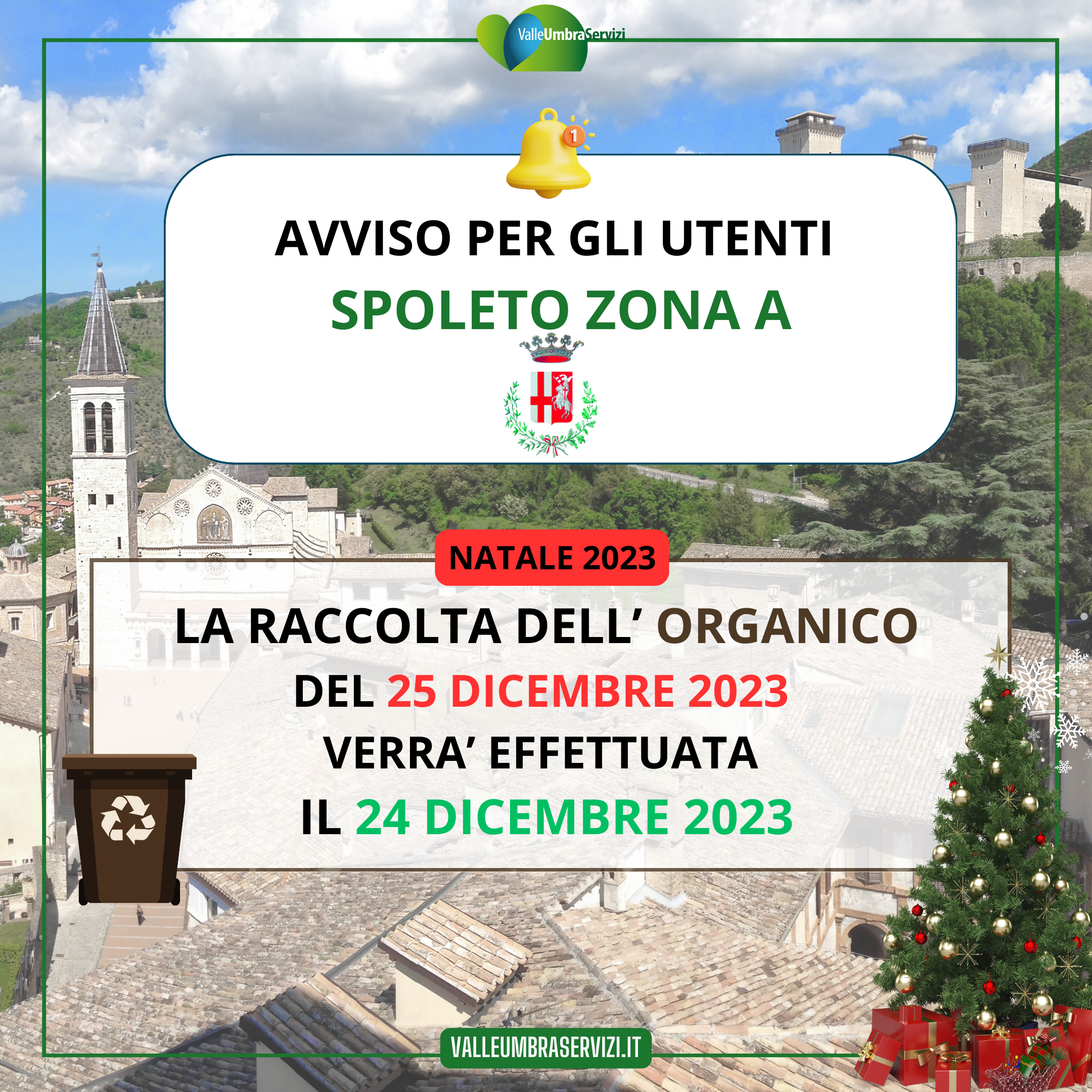 la raccolta dell'ORGANICO del 25 dicembre 2023 verrà effettuata il 26 dicembre 2023 |