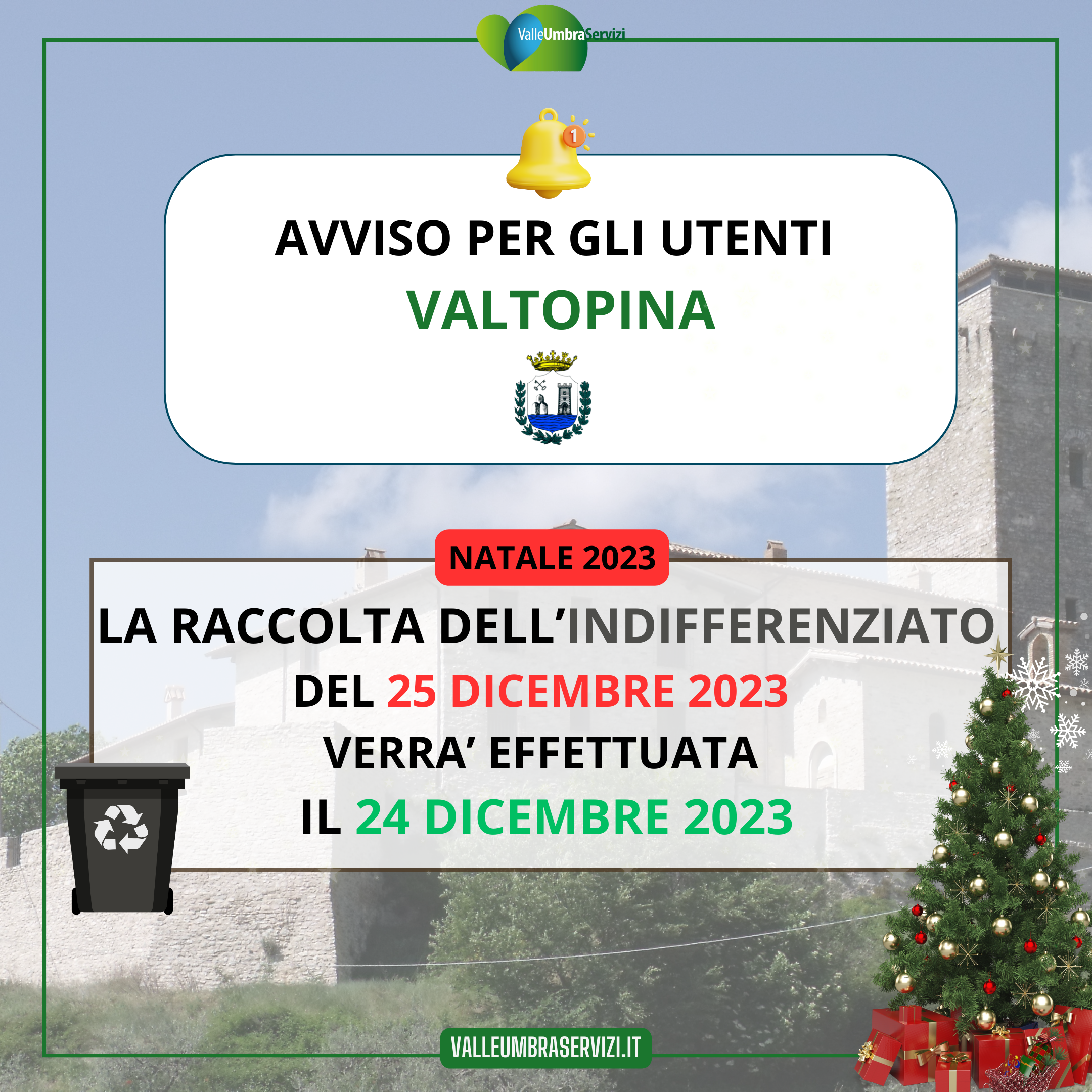 la raccolta dell'indifferenziato del 25 dicembre 2023 verrà effettuata il 24 dicembre 2023 |