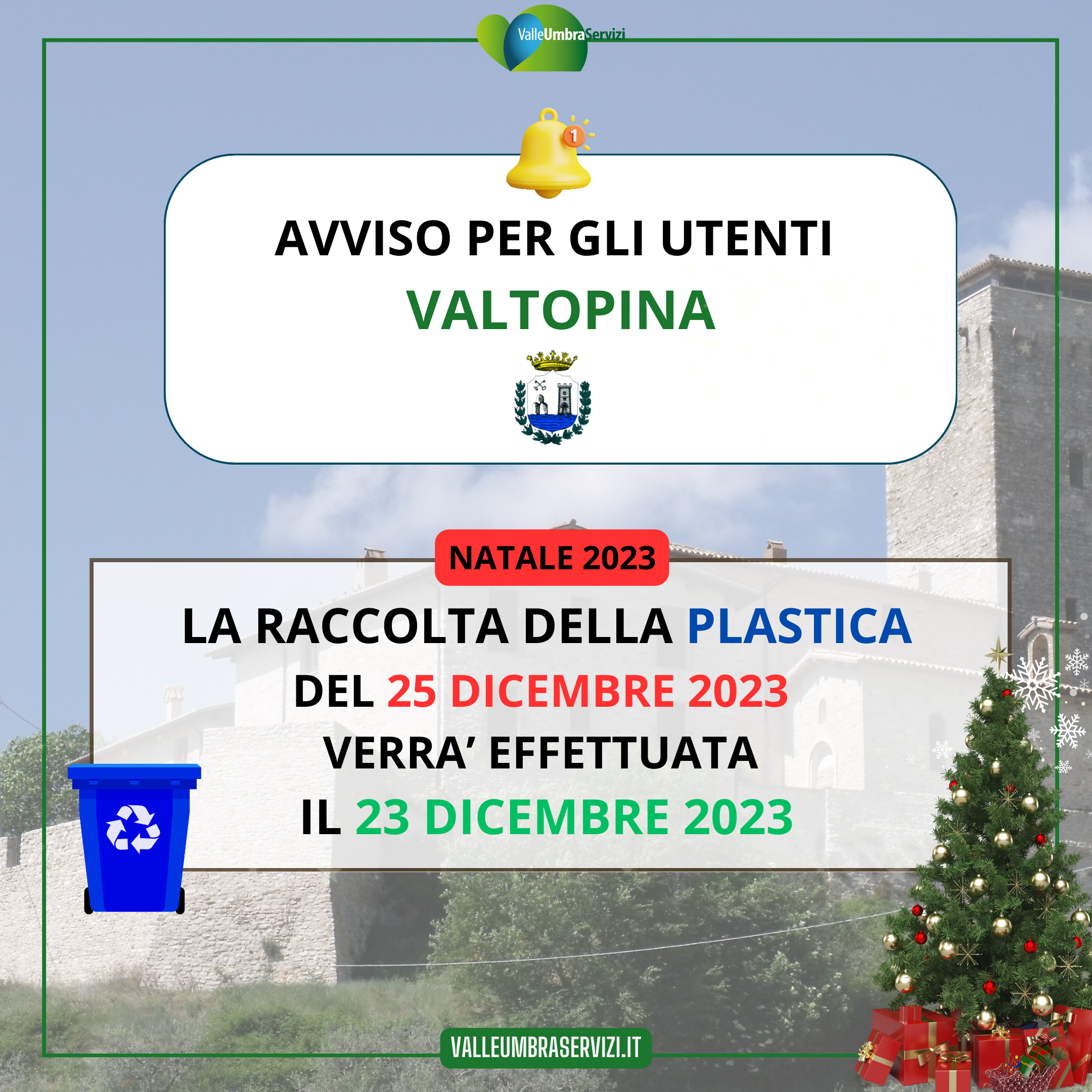 la raccolta della PLASTICA del 25 dicembre 2023 verrà effettuata il 23 dicembre 2023 |