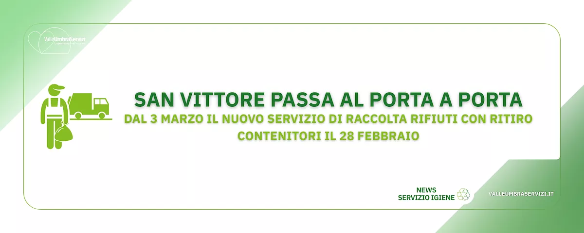 Valle Umbra Servizi informa i cittadini della località San Vittore (Foligno) che da martedì 3 marzo 2026 sarà attivo il nuovo servizio di raccolta rifiuti Porta a Porta, con calendario di riferimento Foligno A.