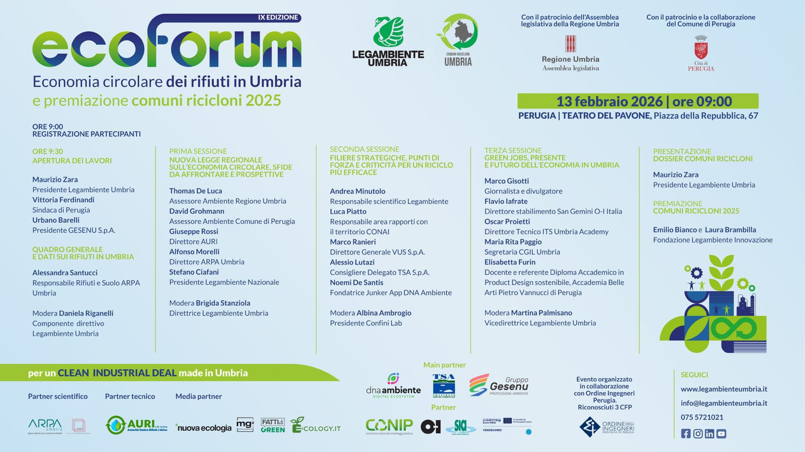 Venerdì 13 febbraio 2026, a partire dalle ore 9.30, al Teatro Pavone di Perugia si terrà la nona edizione dell’EcoForum regionale sull’economia circolare dei rifiuti in Umbria, promosso da Legambiente Umbria con il patrocinio dell’Assemblea Legislativa regionale e del Comune di Perugia.